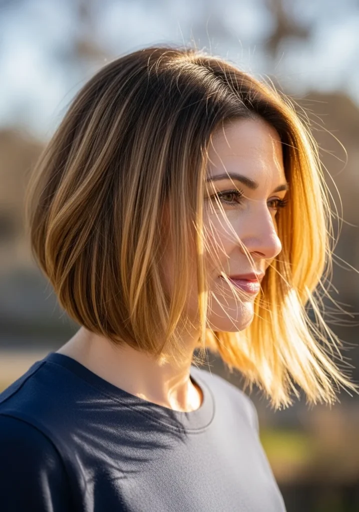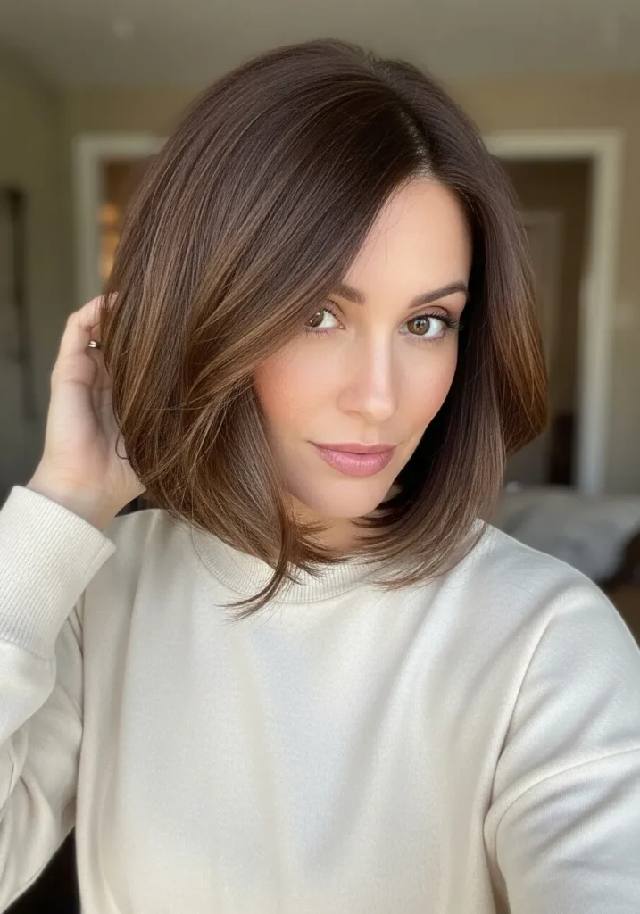 I love this style because it instantly makes me feel put together without trying too hard. The angle gives my face a little lift and the highlights add such a nice pop of brightness. It is one of those cuts that behaves well on busy days yet still looks like I spent time styling it. It feels chic classy and effortlessly wearable which is always a win in my book.