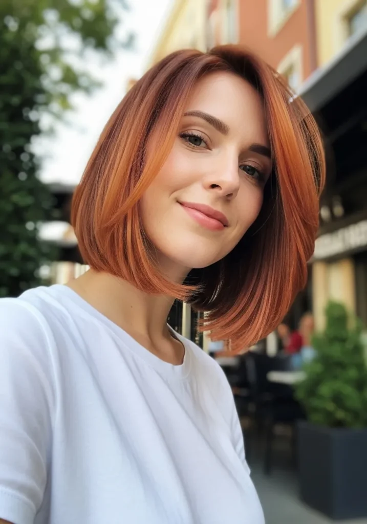 This angled long bob sits just above the shoulders with a gentle forward tilt that gives it a really pretty sense of shape. The texture is smooth and softly polished, and the subtle layering around the ends keeps everything looking light instead of bulky. The warm copper shade is the real star here because it catches the sunlight in the sweetest way and makes the whole cut feel even more vibrant. The overall style is simple, sleek, and effortlessly put together.