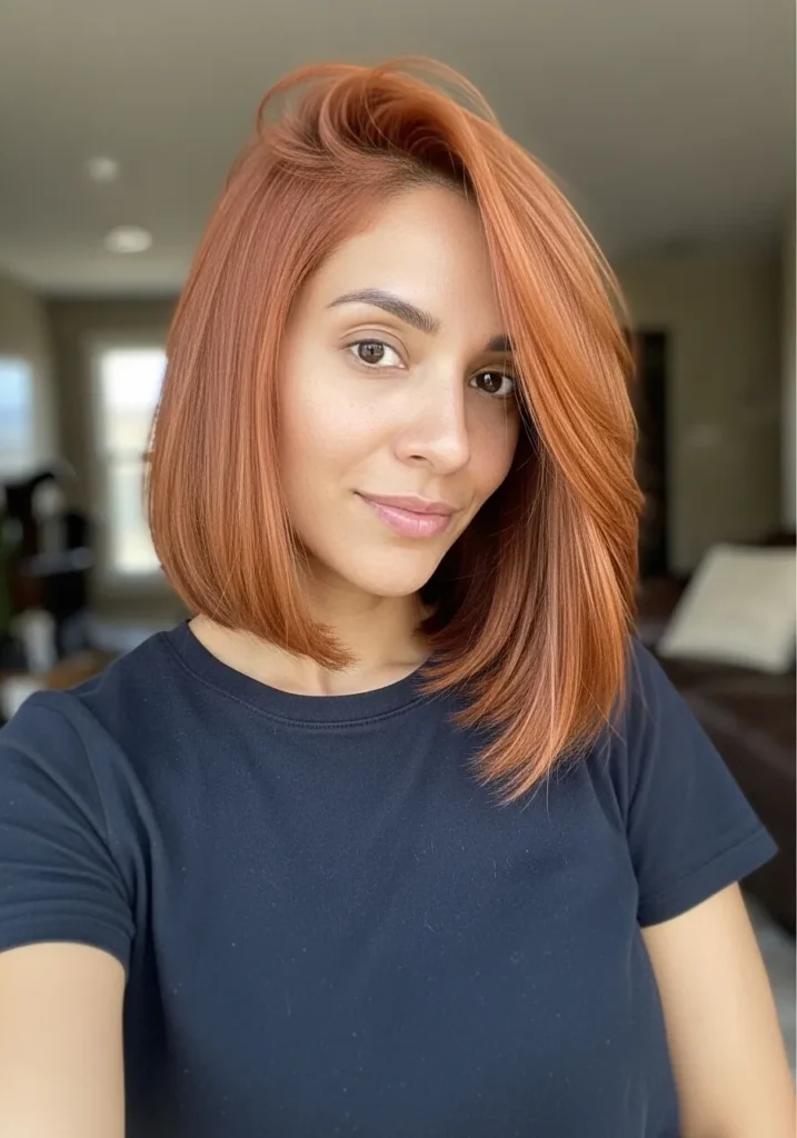 I love this kind of cut because it instantly makes me feel polished without any complicated styling routine. The angle gives my face a little lift, and the copper shade brings out warmth in my skin that I didn’t even know was there. It has that effortless confidence vibe that makes getting ready in the morning feel a whole lot easier.
