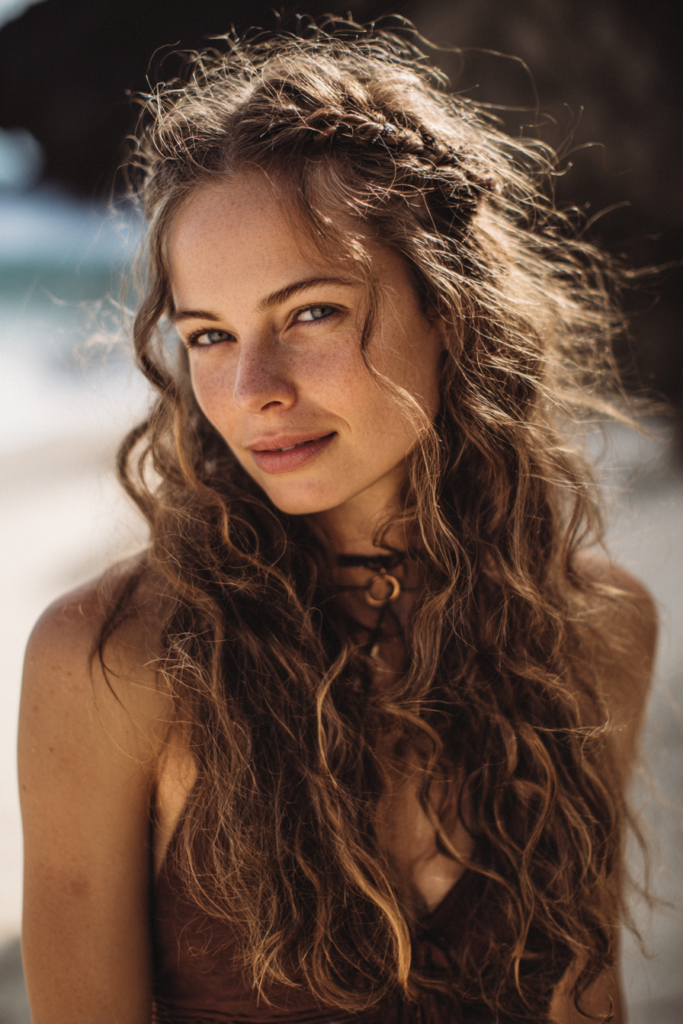Some people love a traditional headband but I think this braided detail is so much cooler for a beach day. It keeps the front sections of your hair from flying into your lip gloss the moment a breeze hits which is a total win in my book. I find this look incredibly flattering because the center part and symmetrical waves frame the face perfectly while giving off those dreamy festival vibes. It is the ultimate way to look put together without needing any actual heat tools or mirrors.