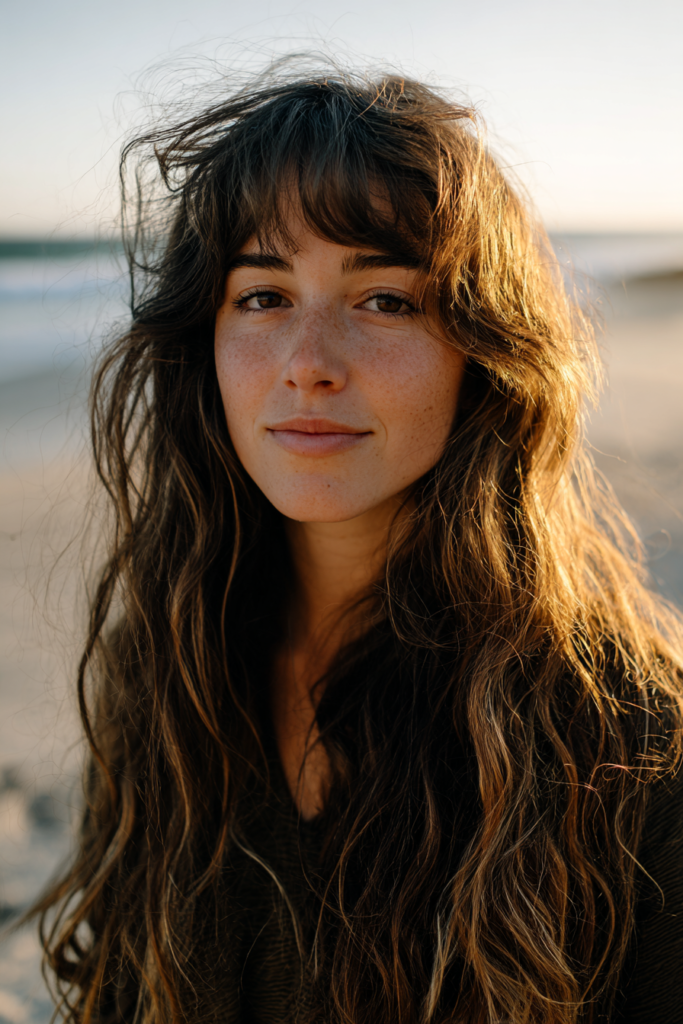 This style features long chest length hair with heavy shaggy layers and a soft eyebrow grazing fringe. The texture is wonderfully messy and lived in with a mix of deep brunette tones and subtle caramel highlights that look like they were earned from days spent in the sun. It has a lot of natural volume at the crown and a slightly gritty finish that gives it a rock and roll edge while remaining perfectly coastal. The bangs are cut to be airy and piecey which allows them to move naturally in the wind without looking flat or stuck to the forehead.