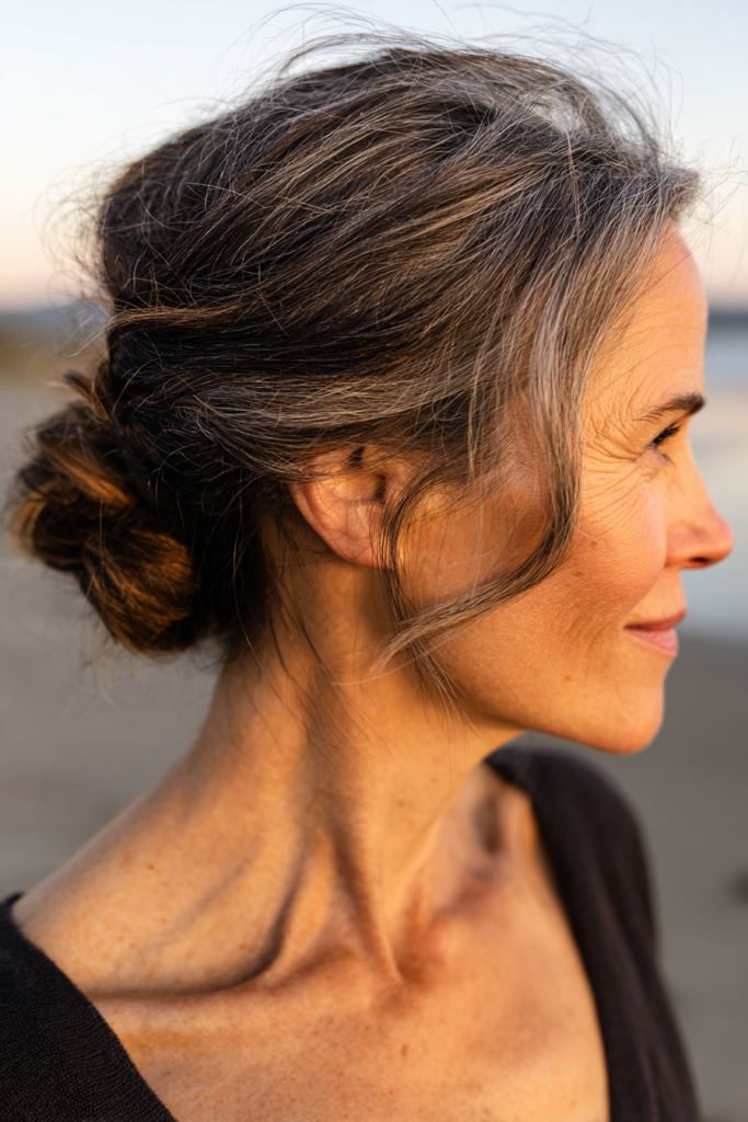 I am a huge fan of this low bun because it is the ultimate secret weapon against a windy shoreline. Some people love letting their hair fly free but having your length secured at the neck means you won’t spend the whole sunset detangling a bird’s nest. It feels so flattering because it highlights your neckline and jewelry while the soft volume on top prevents it from looking flat. This is exactly what you need for those days when you want to look polished and graceful without fighting against the elements.