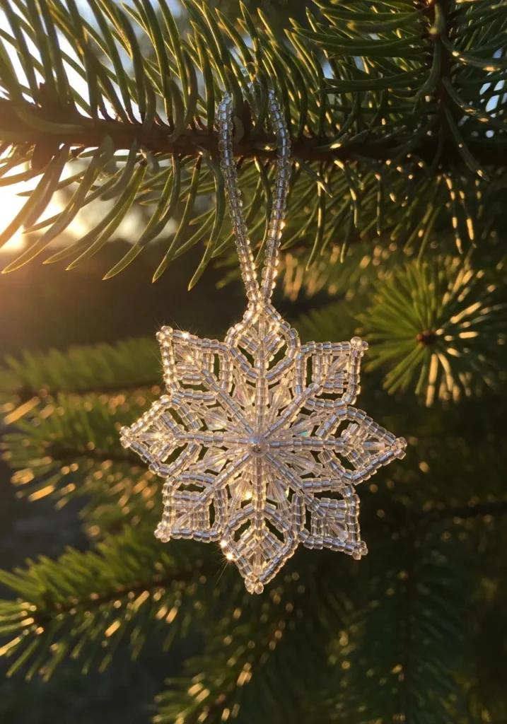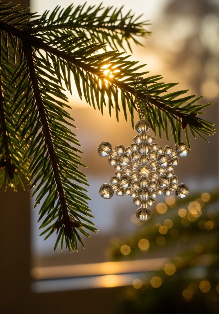 This ornament looks like a frozen snowflake kissed by sunlight. Each tiny crystal bead reflects warm golden light, making it gleam beautifully against the evergreen branch.