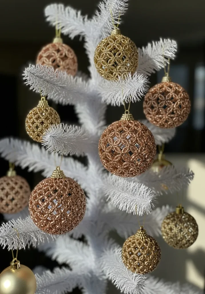 These rose gold and champagne ornaments shimmer beautifully against the white tree branches. Their open beaded patterns make them look light, airy, and absolutely elegant.