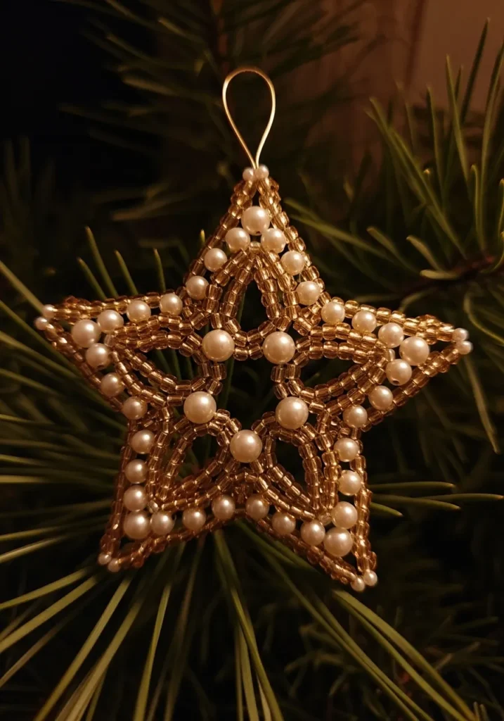 This beaded star mixes creamy pearls with tiny golden beads, creating a look that feels both classic and radiant. The warm light makes every bead glow softly, bringing out that nostalgic Christmas sparkle we all love.