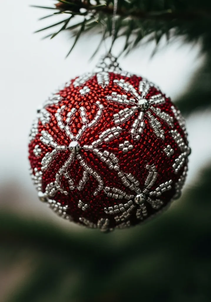 This red and silver ornament is holiday perfection. The tiny seed beads form an intricate pattern that sparkles beautifully against the deep red background, giving off that cozy, traditional Christmas charm.