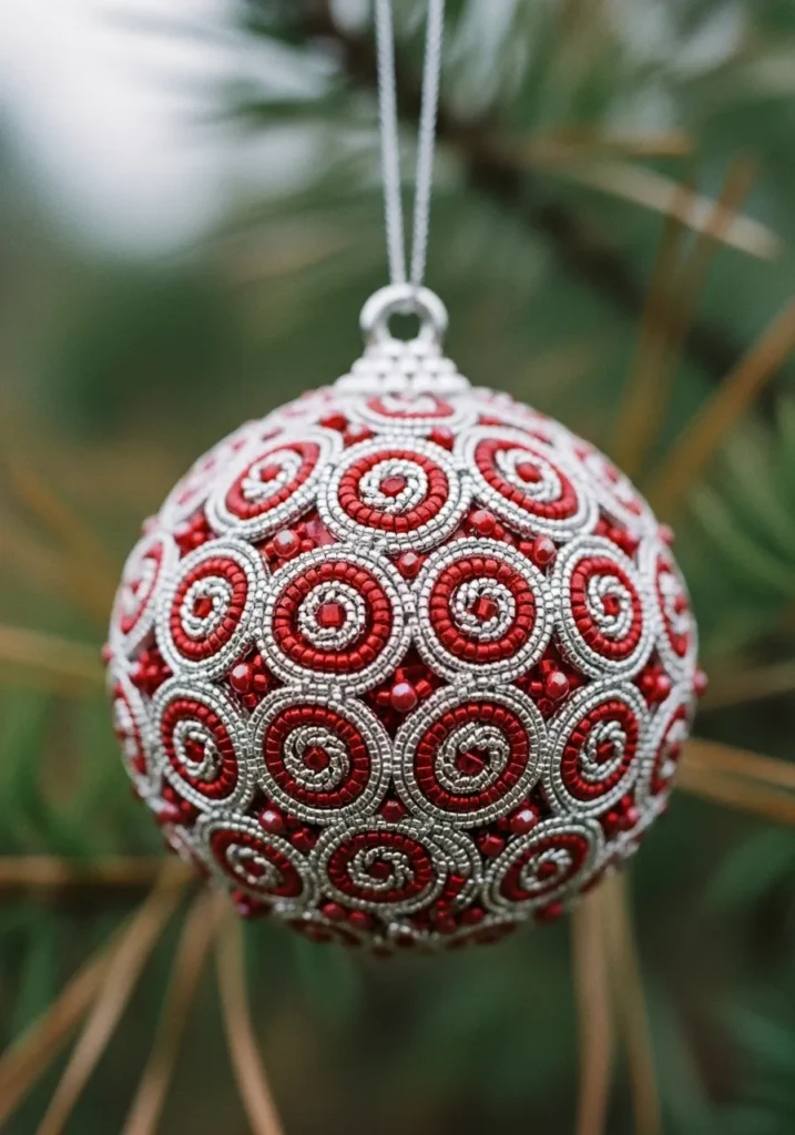 This ornament is a true showstopper, covered in tiny red and silver beads arranged in hypnotic swirling circles. The craftsmanship is so precise that it looks like a piece of art meant to be admired up close.