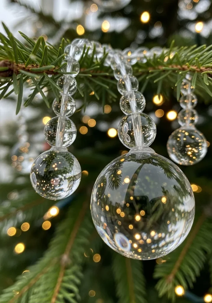 These clear beaded drops look like frozen raindrops hanging delicately from the tree. The way they reflect the warm twinkle of Christmas lights gives them a magical, icy glow that feels straight out of a winter wonderland.