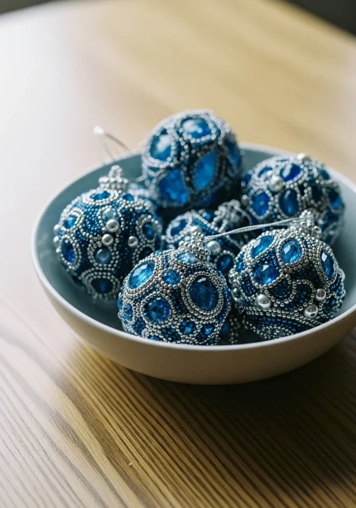 These deep blue beaded ornaments look like little treasures from a royal jewelry box. Each one is covered in intricate silver and sapphire-toned beads, creating a luxurious contrast that’s hard to look away from.