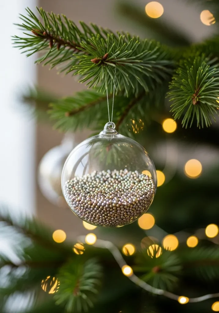 This ornament is a minimalist dream. A simple glass globe filled with shimmering pastel beads creates a modern and delicate look that catches the glow of nearby lights beautifully.