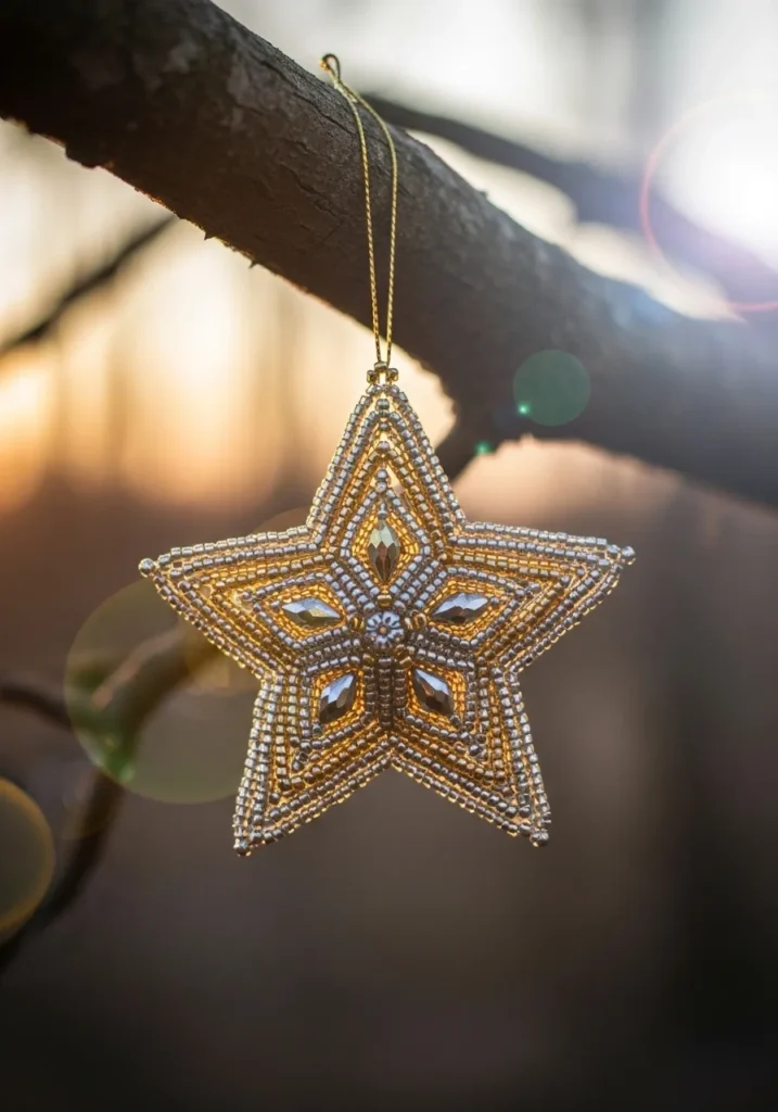 This star-shaped ornament shines like a tiny piece of sunshine, covered in layers of gold and silver beads that catch every hint of light. The intricate beading forms a perfect pattern that glows beautifully against the soft backdrop of a sunset, giving it that timeless, handcrafted charm.