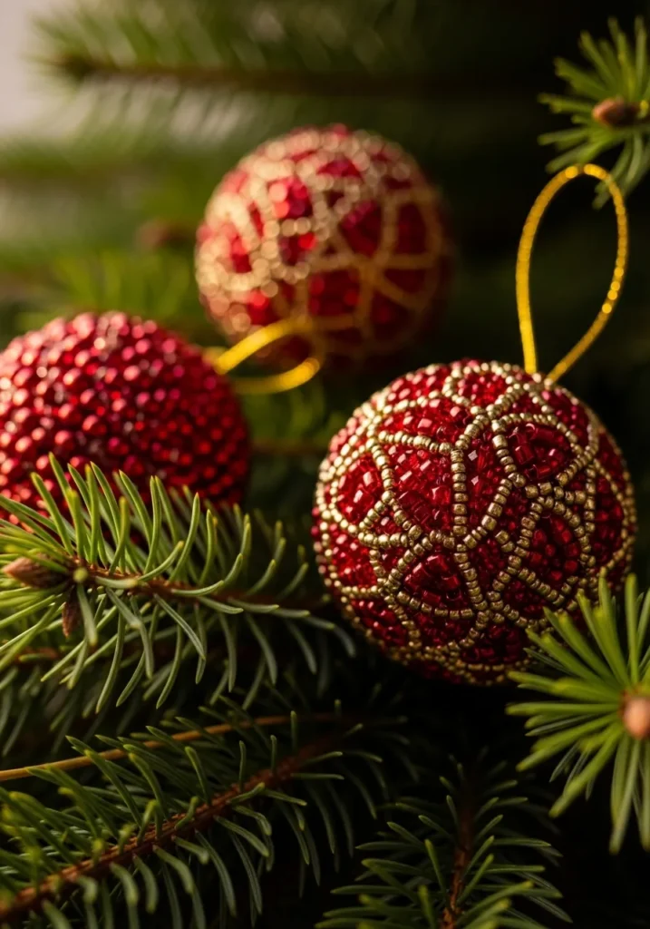 These rich red ornaments shimmer with gold accents that catch the light perfectly between the pine branches. The detailed beadwork gives them a regal, handcrafted look that feels timeless and festive.