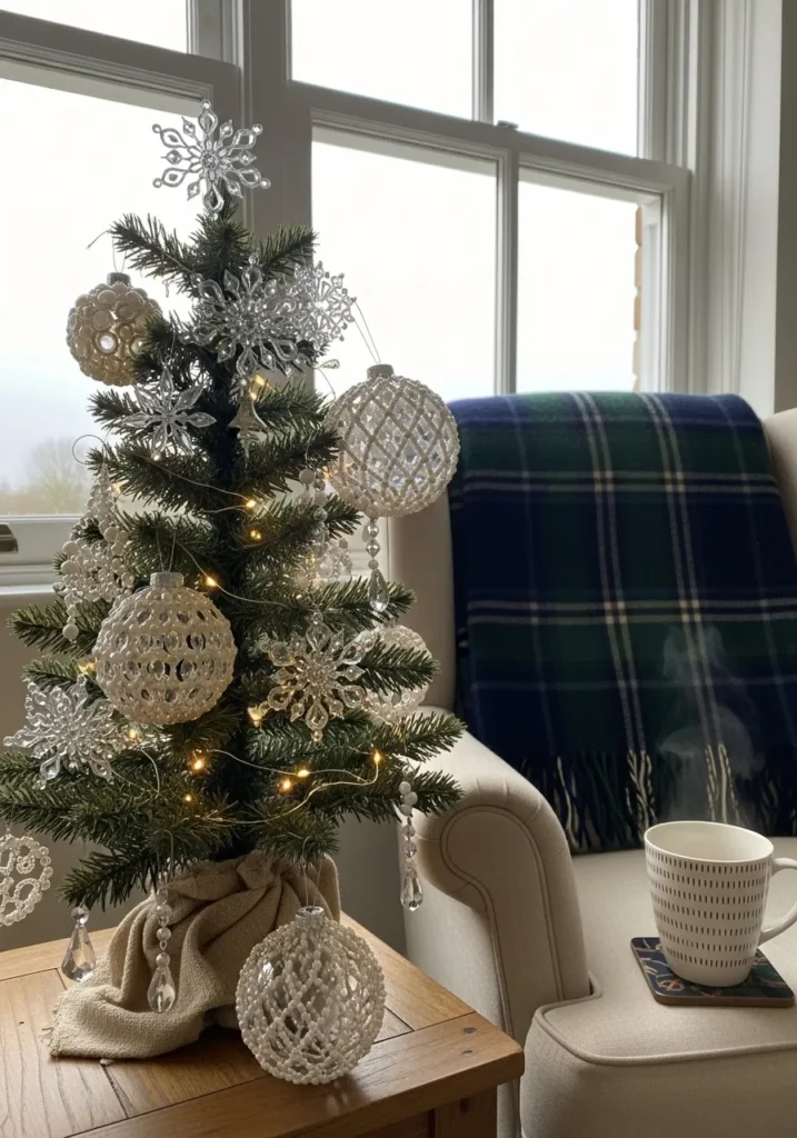This cozy corner setup feels straight out of a holiday postcard. The small Christmas tree is adorned with intricate white and pearl beaded ornaments, each one sparkling gently under soft fairy lights.