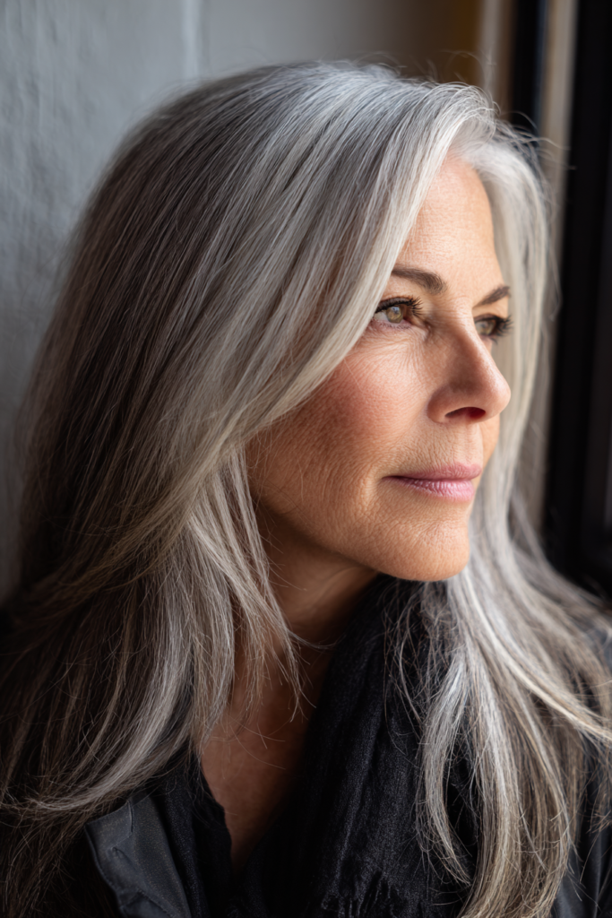 This stunning long style showcases a sophisticated blend of natural silver and cool charcoal tones. The hair is cut with long graceful layers that taper toward the ends to create a sleek silhouette without sacrificing body. Its texture is remarkably smooth and straight but the subtle layering around the face provides a gentle curve that keeps the look from feeling too sharp. The color is a masterclass in embracing natural transitions with bright icy strands at the crown that melt into deeper slate shades underneath. It is styled with a soft side part that allows the hair to sweep elegantly across the forehead for a polished finish.