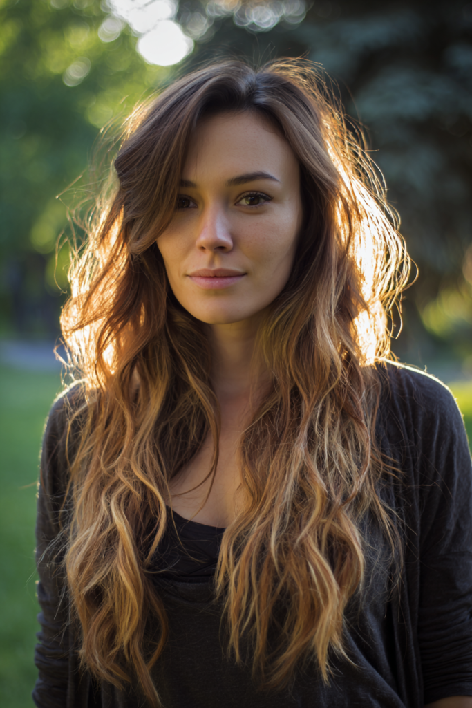 This ultra long layered cut is the definition of free spirited glam with hair cascading well down the back. It features a heavy dose of internal layers that prevent the length from looking weighed down while encouraging those gorgeous textured waves to take center stage. The color is a stunning transition from a deep chocolate root into warm honey and golden blonde ribbons that look like they were painted by the sun. It is styled with a soft side sweep and plenty of piecey volume through the mid lengths to create that iconic beachy movement that never goes out of style.