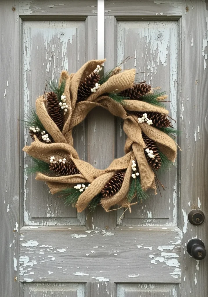 This weathered gray wooden door tells its own story, and the rustic burlap ribbon wreath fits it perfectly. The mix of burlap folds, pinecones, and soft sprigs of evergreen creates a natural, handmade look that feels calm and earthy.