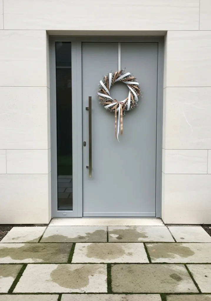 This sleek gray entryway proves that less can be more. The wreath’s swirling ribbons in shades of ivory and champagne gold look modern and chic against the soft neutral backdrop, giving the space a clean, sophisticated feel.