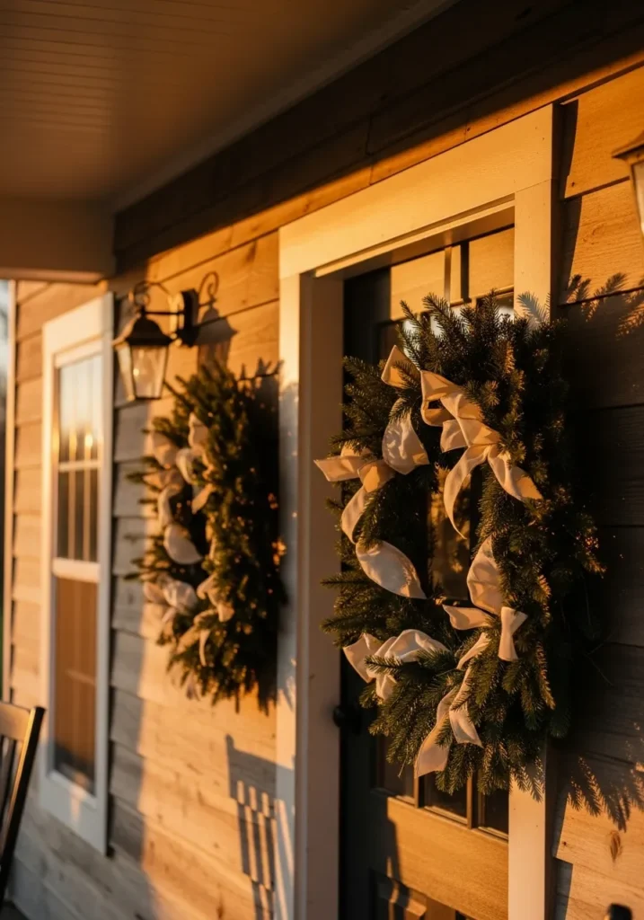 This rustic porch glows under the golden hour light, with twin wreaths wrapped in soft cream ribbons hanging on a cozy wooden facade. The natural greenery paired with warm tones makes the whole space feel calm and inviting.