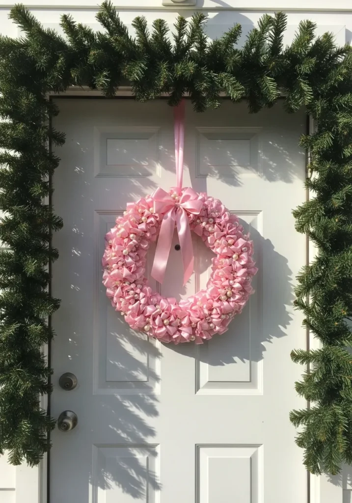This soft pink ribbon wreath looks absolutely dreamy against a crisp white door. Each satin bow is tucked neatly with small pearl-like accents, creating a fluffy and elegant finish. The green garland framing the doorway adds just the right touch of classic Christmas charm.