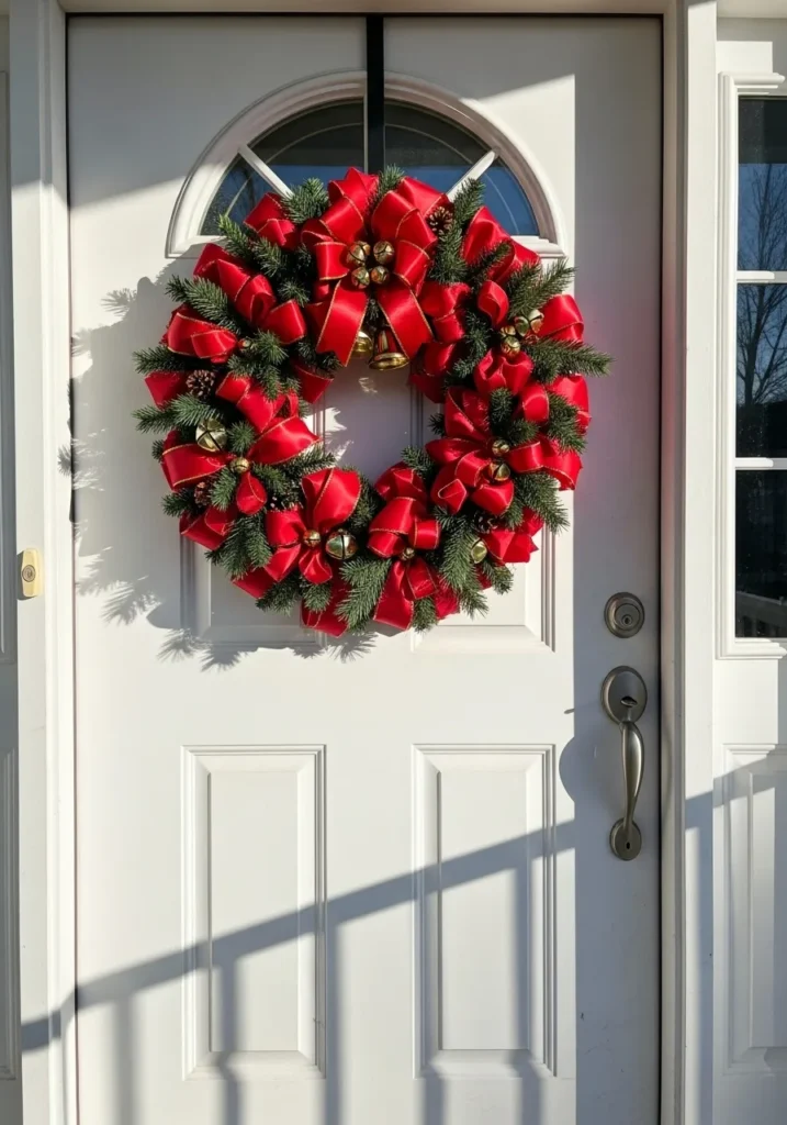 This front door design captures the heart of Christmas with a lush wreath wrapped in vibrant red ribbons and dotted with shiny gold bells. The deep green pine gives it texture and fullness, while the crisp white door lets every festive detail stand out beautifully.
