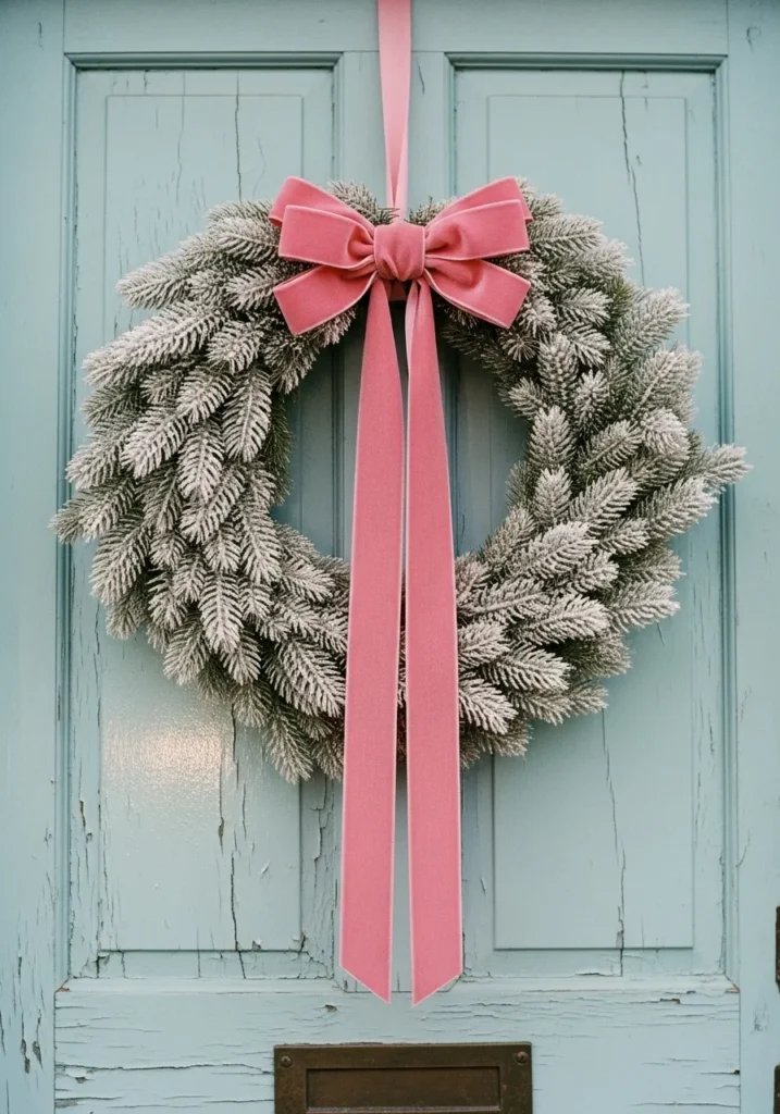 Here’s a soft and dreamy take on Christmas decor. The frosted evergreen wreath with its large pink velvet bow hangs gracefully on a pale blue door, giving off a snowy fairytale vibe that feels fresh and modern.