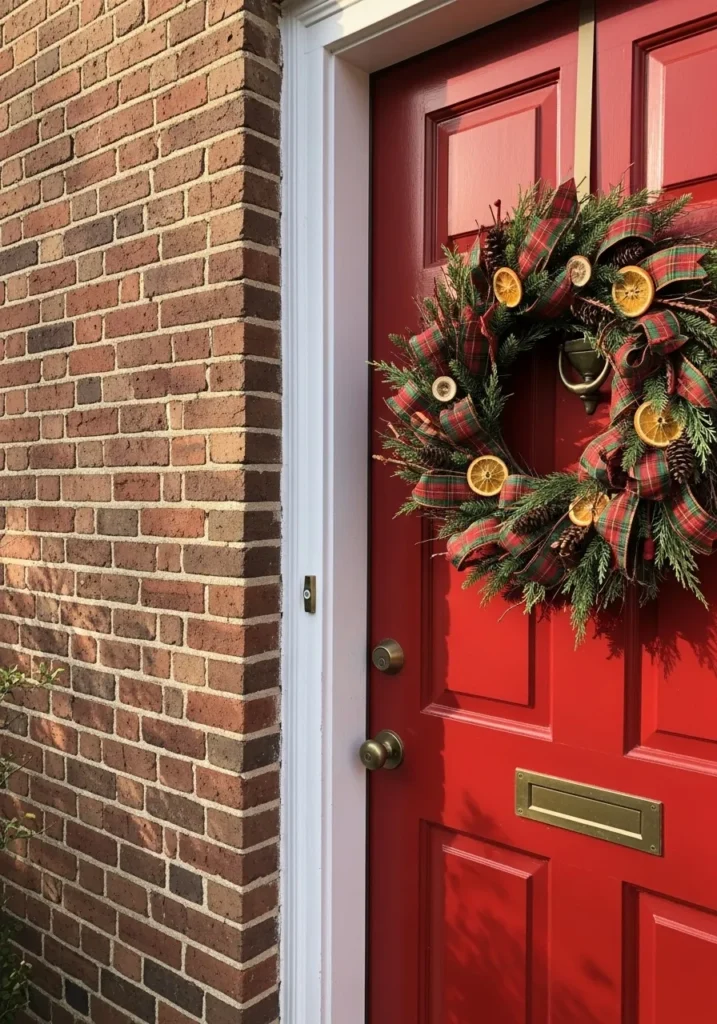 The red brick wall and matching red door create a warm backdrop for this stunning plaid ribbon wreath. Sprigs of pine and slices of dried oranges add texture and color, giving it that nostalgic, homemade Christmas look.
