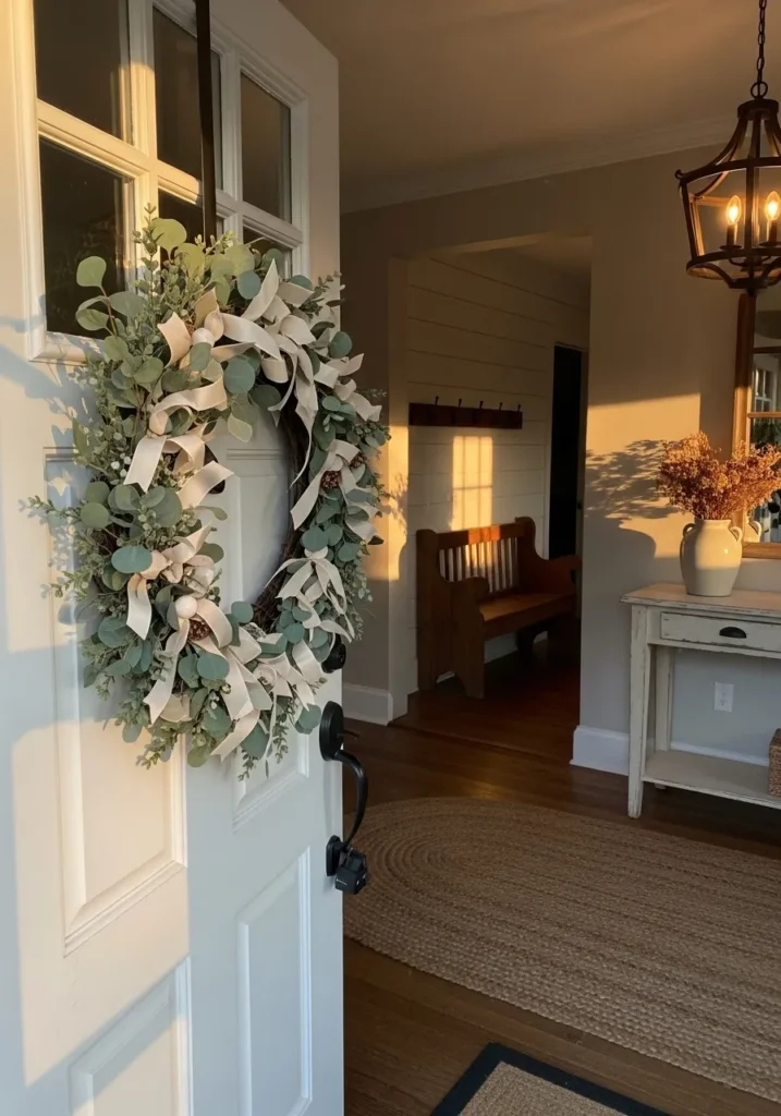This airy white entryway glows softly with golden afternoon light, and the eucalyptus wreath tied with cream ribbons captures that serene moment beautifully. The muted greens and soft neutrals make it look peaceful yet elegant.