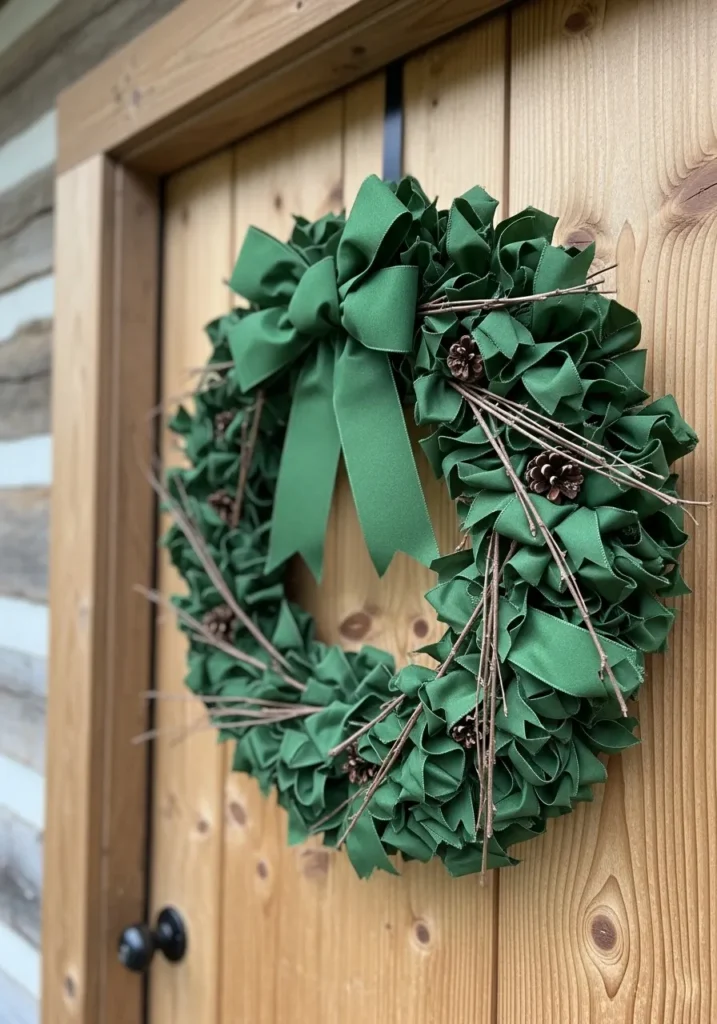 This natural wooden door sets the perfect scene for a deep green ribbon wreath decorated with small pinecones and twigs. The texture of the ruffled ribbon gives it a full, festive look that still feels organic and earthy.