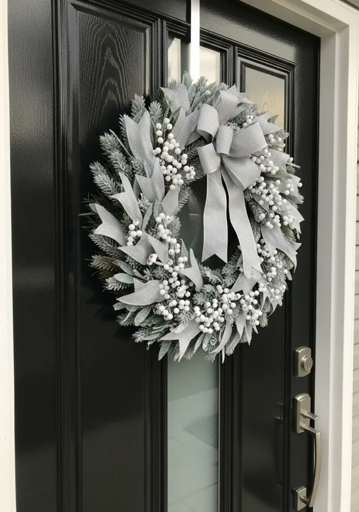 The sleek black door gives this frosted silver ribbon wreath an elegant stage to shine. The icy tones, white berries, and soft shimmer of the ribbons make it feel like winter sophistication at its finest.