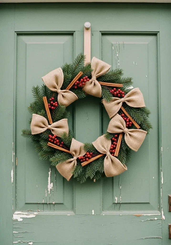 This wreath blends rustic charm with timeless holiday coziness. The burlap bows, cinnamon sticks, and clusters of red berries rest beautifully against evergreen sprigs, all tied together on a soft sage green door.