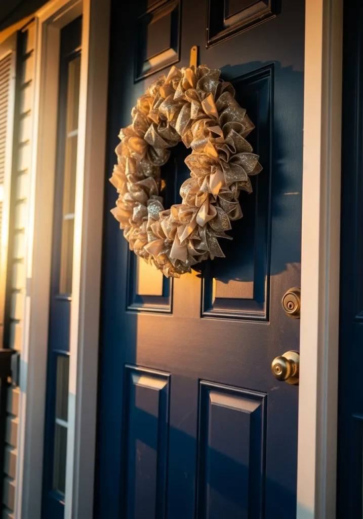 This warm-toned wreath gleams beautifully in the golden sunset light. The glittering gold ribbons curl gracefully, catching the light against a deep navy-blue door, creating a luxurious yet welcoming entrance.