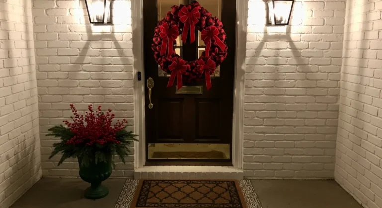 This charming white entryway feels bright and welcoming with its bold red and white ribbon wreath taking center stage. The crisp white door and trim make the cheerful wreath pop beautifully, creating that timeless Christmas look that never fails to lift the mood.