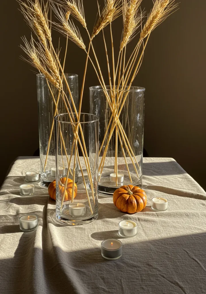 Tall glass vases filled with golden wheat stalks create a striking yet minimal look. The natural textures shine against the clear glass, with tea lights and a couple of small pumpkins scattered at the base. It feels earthy, autumnal, and perfectly seasonal.