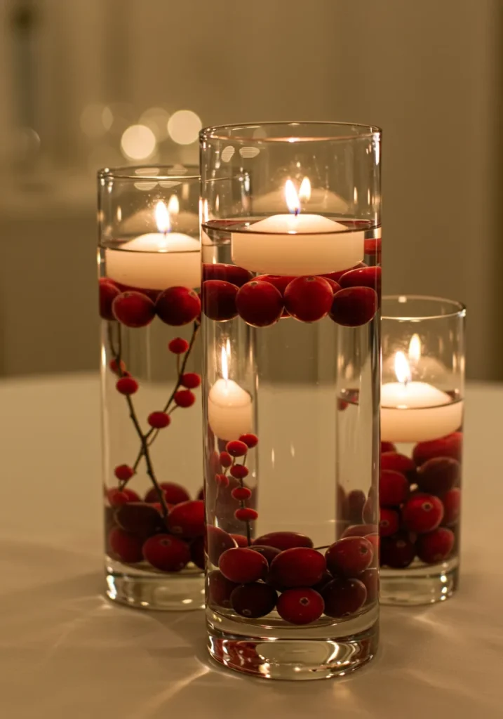 Tall glass vases are filled with water and fresh cranberries, each holding a floating candle at the top. The red berries glow beautifully under the candlelight, making the whole setup feel festive and chic.