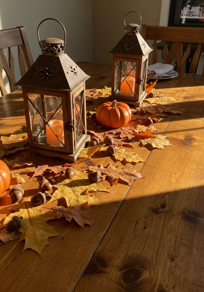 Two rustic lanterns sit on a table runner of scattered leaves, pumpkins, and acorns. The warm candle glow inside the lanterns makes the display feel cozy and inviting.
