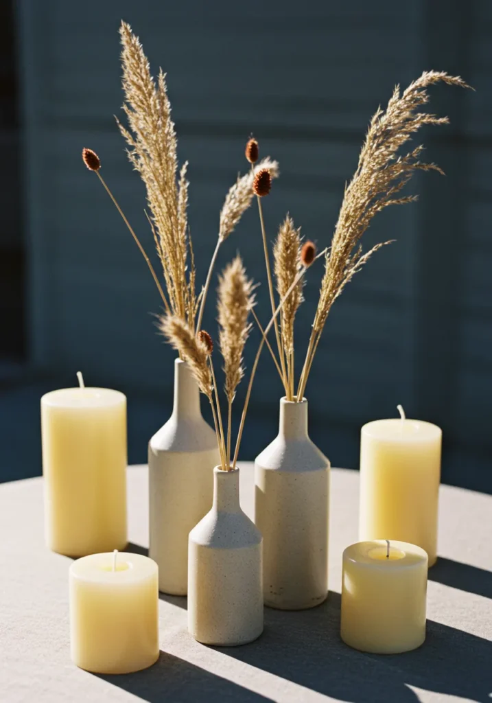 Neutral-toned vases hold sprigs of pampas grass, styled alongside soft cream pillar candles. The look is clean, minimal, and effortlessly modern while still feeling warm.