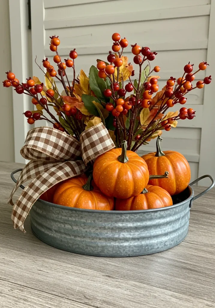 A galvanized tin tray holds mini pumpkins, berry branches, and a brown gingham bow tied off to the side. The mix of orange and red tones with the rustic tin base creates a charming farmhouse look.