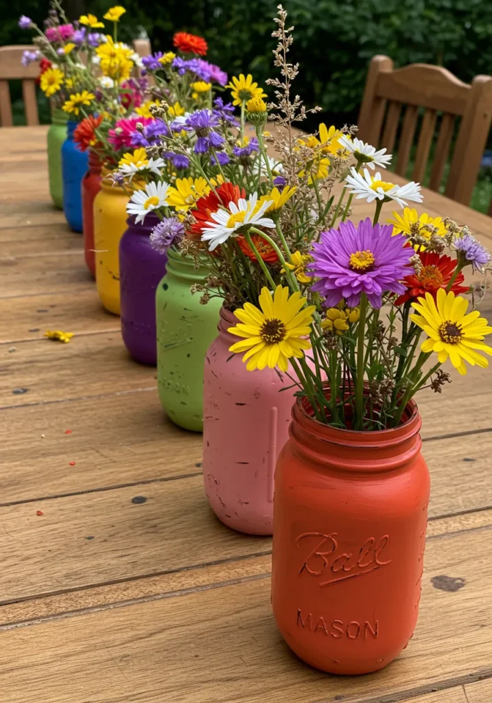 A row of mason jars painted in cheerful colors like orange, pink, green, and blue holds bunches of wildflowers. The mix of daisies, asters, and bright pops of yellow makes the whole setup feel playful and full of life.