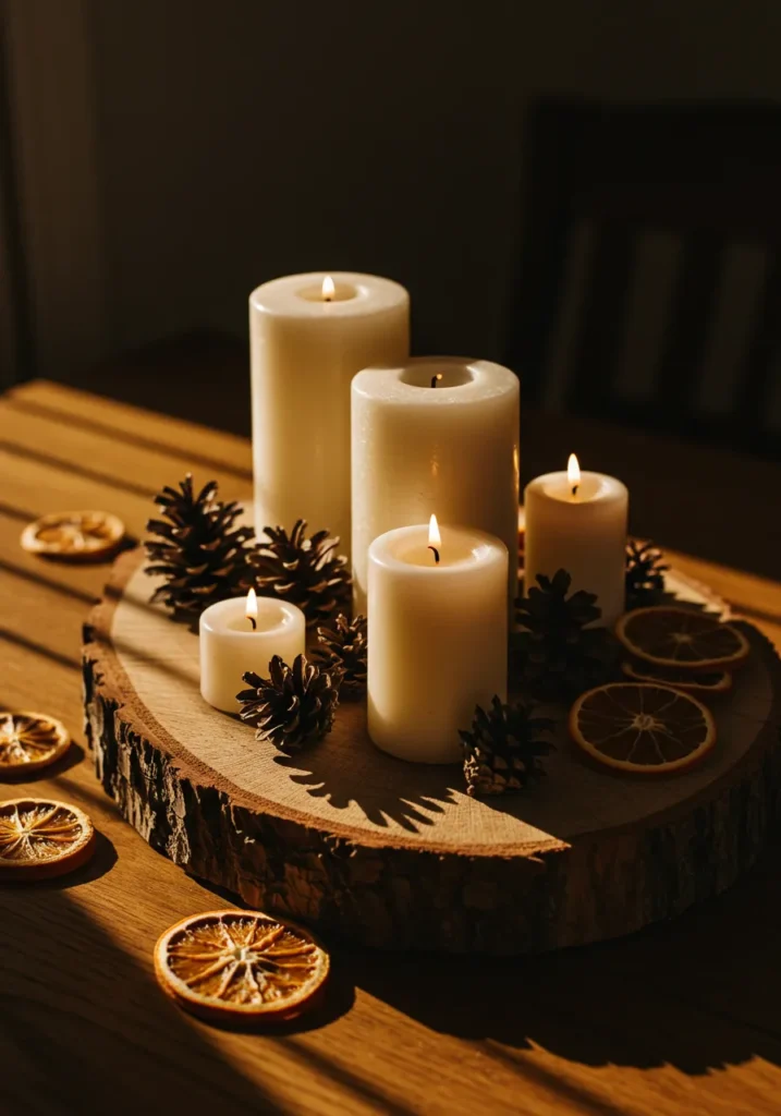 A chunky wood slice base holds a grouping of ivory pillar candles surrounded by pinecones and dried orange slices. The flicker of candlelight reflects beautifully on the natural textures, creating a cozy and earthy display.