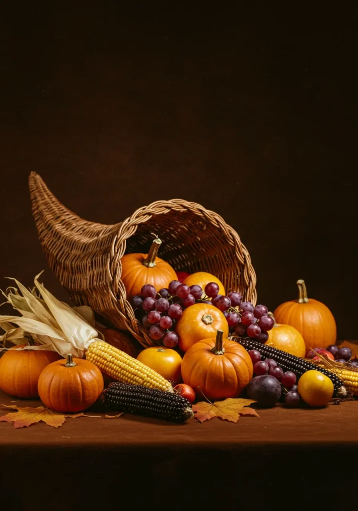 A woven cornucopia spills over with pumpkins, grapes, colorful corn, and seasonal fruits. The mix of rich tones and textures makes it a bold and eye-catching classic.