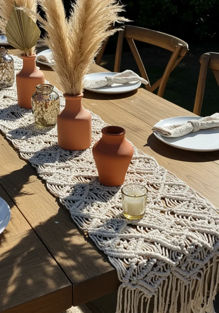 A textured macrame runner stretches down the table, topped with clay vases holding pampas grass and dried palms. The mix of earthy textures and neutral tones creates a soft bohemian vibe.