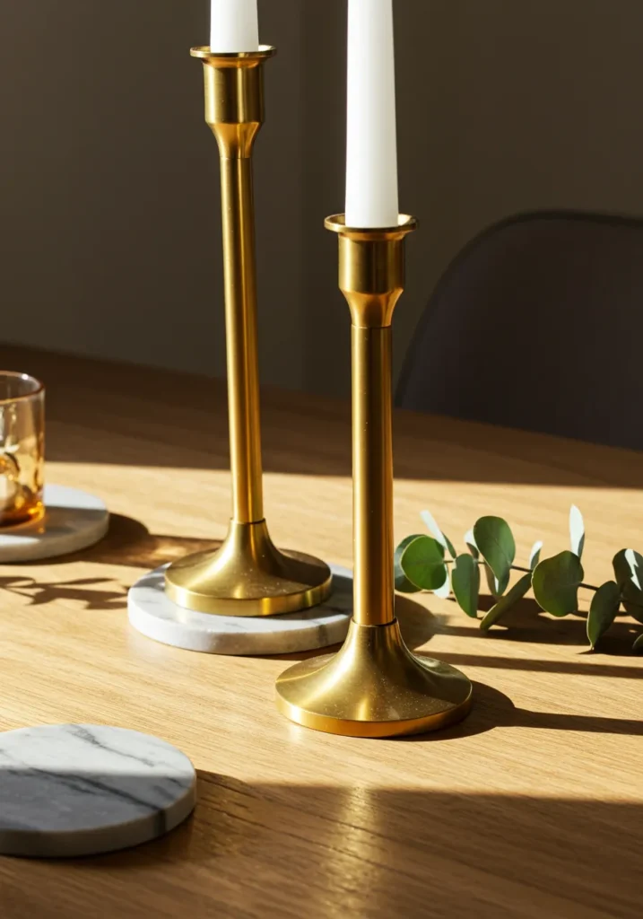 Slim gold candlesticks with white tapers sit neatly on marble coasters with sprigs of greenery placed nearby. The clean lines and metallic finish create a polished and modern centerpiece.