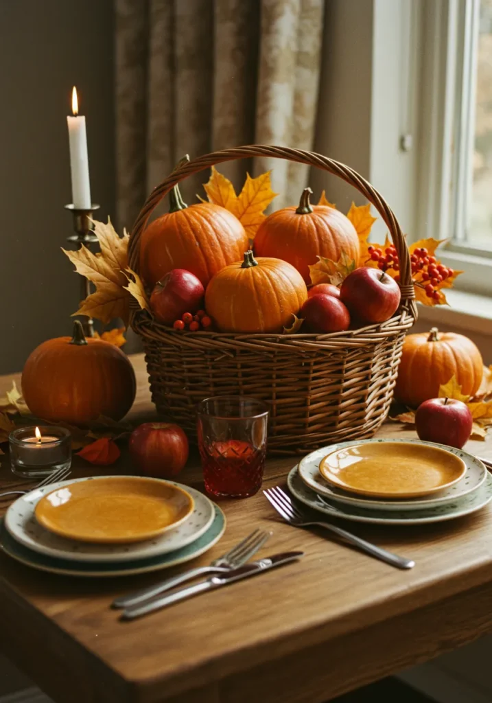 A woven basket overflowing with pumpkins, shiny red apples, and colorful leaves brings a true harvest feeling to the table. The arrangement has a full, abundant look that instantly reminds me of the season’s bounty.
