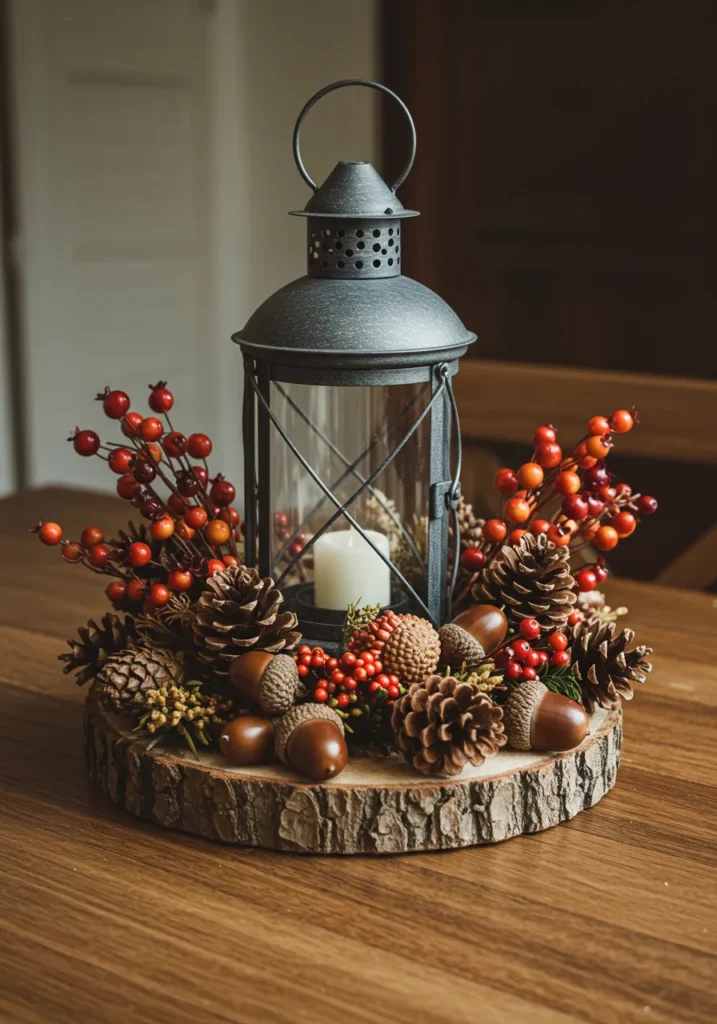 A rustic black lantern sits at the center of a wooden slice, surrounded by pinecones, acorns, and sprigs of red berries. The mix of textures gives it a warm woodland charm.
