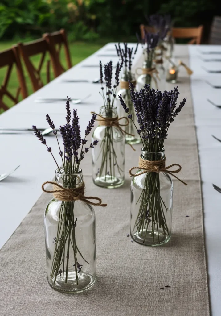 Here, clear glass bottles tied with twine are each filled with sprigs of dried lavender, lined up neatly along a neutral table runner. The look is understated yet so charming, with the soft purple lavender adding a pop of natural color. It’s the kind of setup that feels airy and welcoming, especially if you’re hosting outdoors.