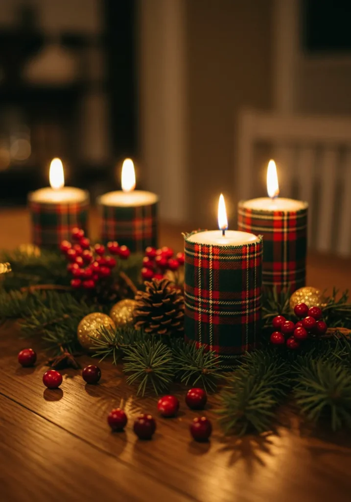 This table design combines plaid-wrapped candles with sprigs of evergreen, pinecones, and bright red berries. The mix of patterns and natural elements makes it feel both festive and traditional. The candles glow warmly against the darker tones, creating a cozy mood that feels just right for the season.