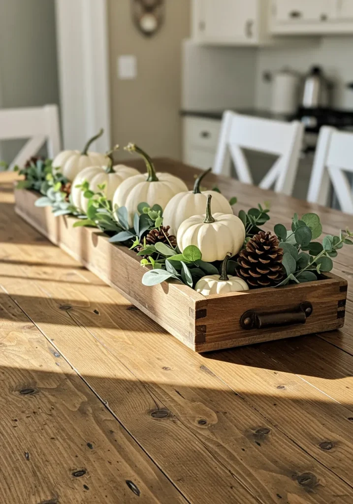 This design features a long rustic wooden box filled with white pumpkins, pinecones, and fresh greenery. The muted tones feel calm and elegant, while the mix of textures adds just the right amount of visual interest. The arrangement stretches across the table, making it the perfect centerpiece for family-style meals where everyone gathers around.