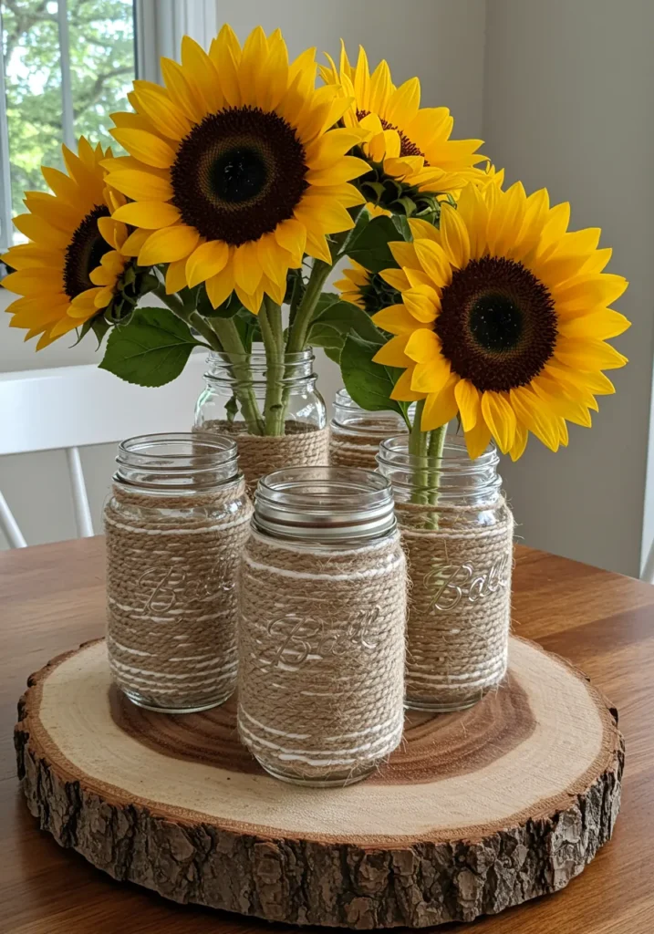 A cluster of mason jars wrapped in twine holds bright, cheerful sunflowers. The jars sit on a wood slice base, bringing in a rustic farmhouse vibe that feels casual yet put together.