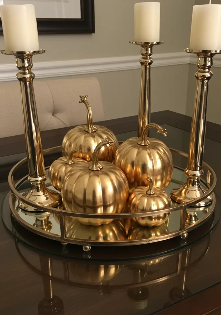 This centerpiece is polished and dramatic with metallic gold pumpkins arranged on a mirrored tray. Tall golden candlesticks frame the pumpkins, and the reflections make the whole thing shimmer with elegance.