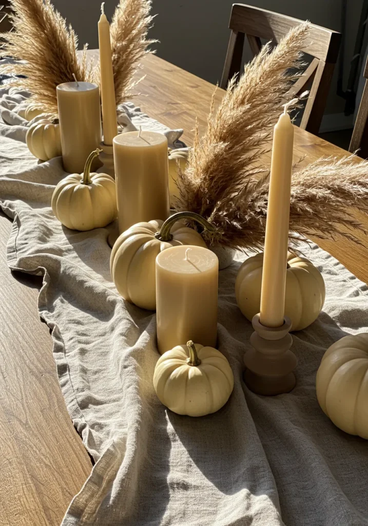 Neutral pumpkins and beige candles are paired with fluffy pampas grass along a crinkled linen runner. The soft tones blend seamlessly while still feeling cozy and seasonal.
